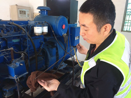 圖為工作人員在檢查發電機機油