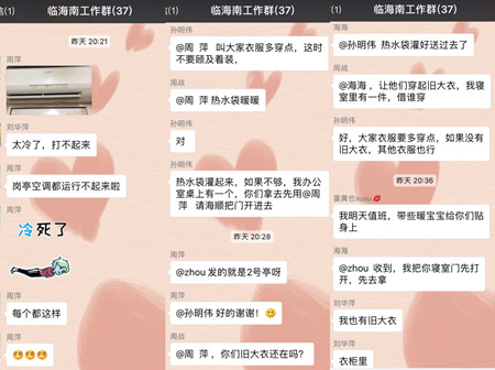 “太冷了,崗亭空調(diào)全都運行不起來了。” “每個崗亭都一樣?!?/span> “冷死啦!” “修空調(diào)的師傅來了,檢查了一下,他說這個沒辦法,是因為天氣太冷的原因,并不是壞了?!?/span> “大家衣服趕緊多穿點,誰有舊的工作大衣。” “熱水袋灌起來,不夠,我的拿去先用。” “我也有舊大衣?!?/span>