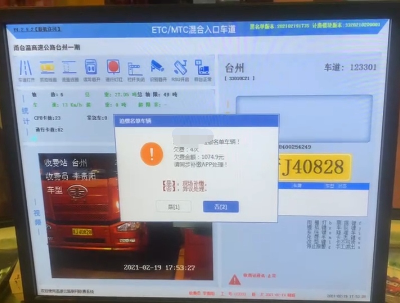 自取消省界收費站全國高速公路聯(lián)網(wǎng)后,跨省追繳通行費一直是個大難題,不少司機的省外通行費因無法追繳,造成通行費不斷流失。交通部為了適應(yīng)“全國一張網(wǎng)”稽核業(yè)務(wù)工作需要,確保各收費站現(xiàn)場有序處理追繳名單車輛,避免造成社會輿情和人身財產(chǎn)安全事件,研發(fā)了全國稽核通行費補費系統(tǒng)。 2月19日晚17點50分左右,臺州收費所進口迎來一輛車牌為浙J開頭的六類貨車,車道屏幕顯示為“浙J XXXXXX追繳名單車輛,欠費4次,欠費金額1074.9元,請同步補繳APP處理。”當班收費員見此詢問駕駛員是否欠費,并喊來當班班長張錚過來處理。