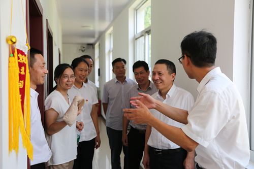 圖為集團(tuán)總經(jīng)理張建平在文明寢室流動紅旗前暢談